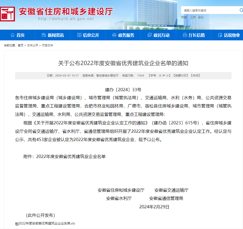 關于公布2022年度安徽省優秀建筑業企業名單的通知